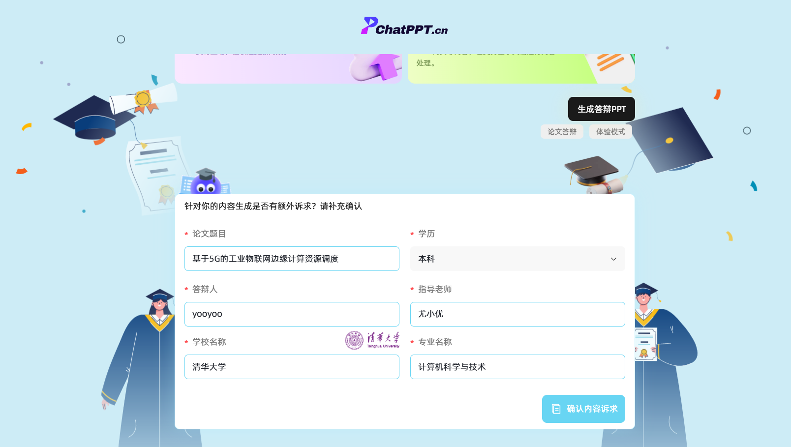 选择生成答辩PPT,无需上传论文文档,只需输入论文题目、学历、答辩人、专业等信息。AI就会自动为你适配风格主题,解析论文题目生成内容大纲。确认大纲和内容无误后即可生成完整的答辩PPT.
