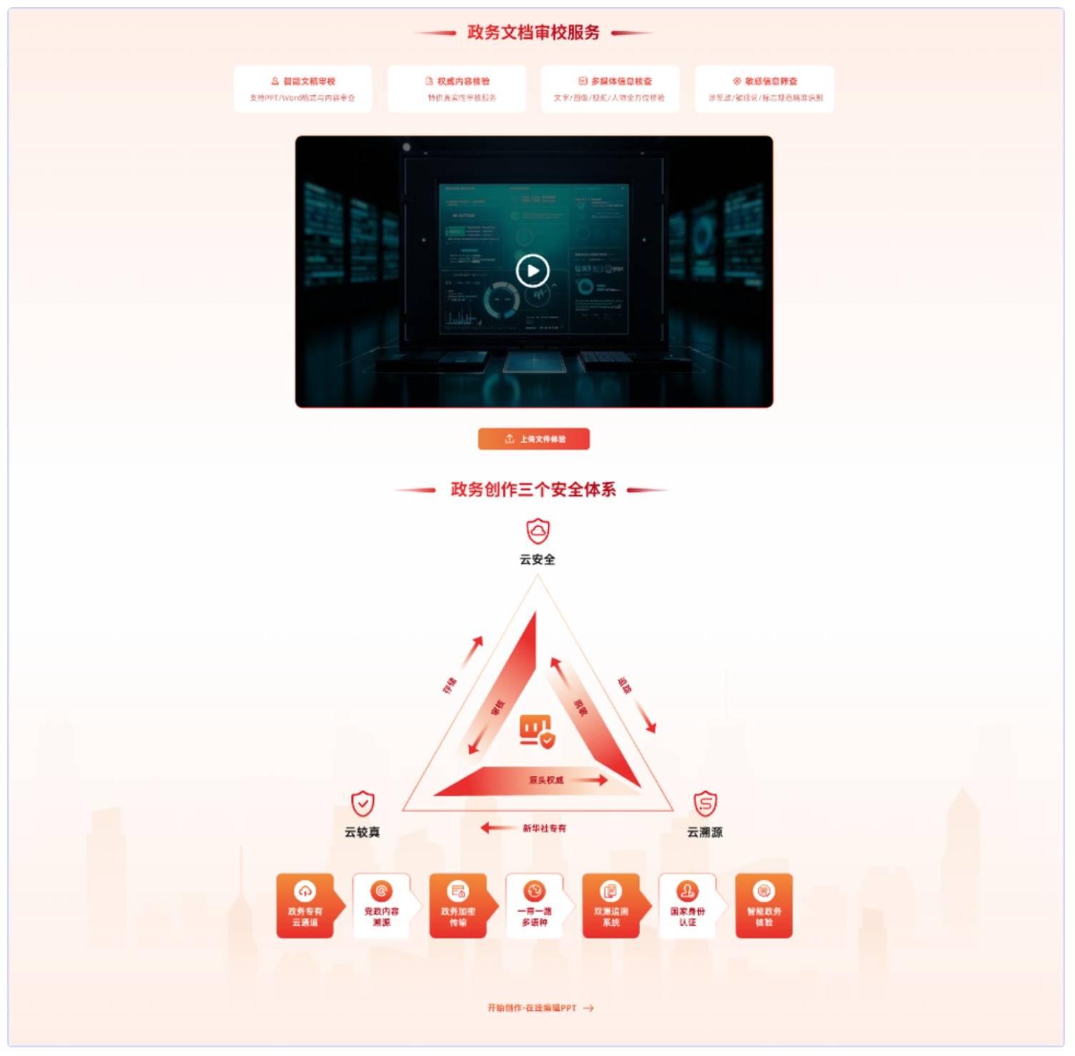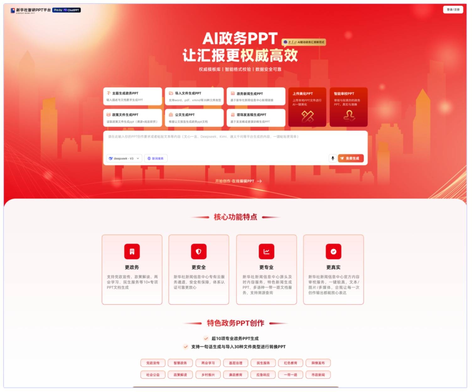 聚焦党政工作汇报、政策解读汇报、专项工作总结等核心场景,以“权威背书+专业审校”为核心,将新华社的新闻信息权威性与PPT制作的场景化需求深度结合,确保每一份输出的PPT不仅在版式设计上贴合党政场景庄重、规范的风格,更在内容层面具备“政治正确、表述严谨、数据可靠、案例权威”的核心特质。