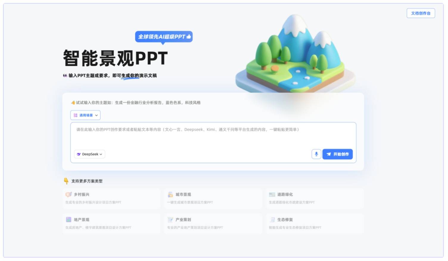 基于此,我们聚焦市政、设计行业的提案场景痛点,打造 “行业知识库 + 多模态 AI 引擎 + 全流程协同” 三位一体的 AI 综合解决方案,无需复杂操作,仅需输入项目核心信息(如市政项目的 “建设地点、项目类型、核心目标”,设计项目的 “客户需求、场地条件、设计风格”),即可一键生成符合行业规范、兼具专业深度与视觉质感的提案 PPT 报告,彻底重构设计提案的生产流程。