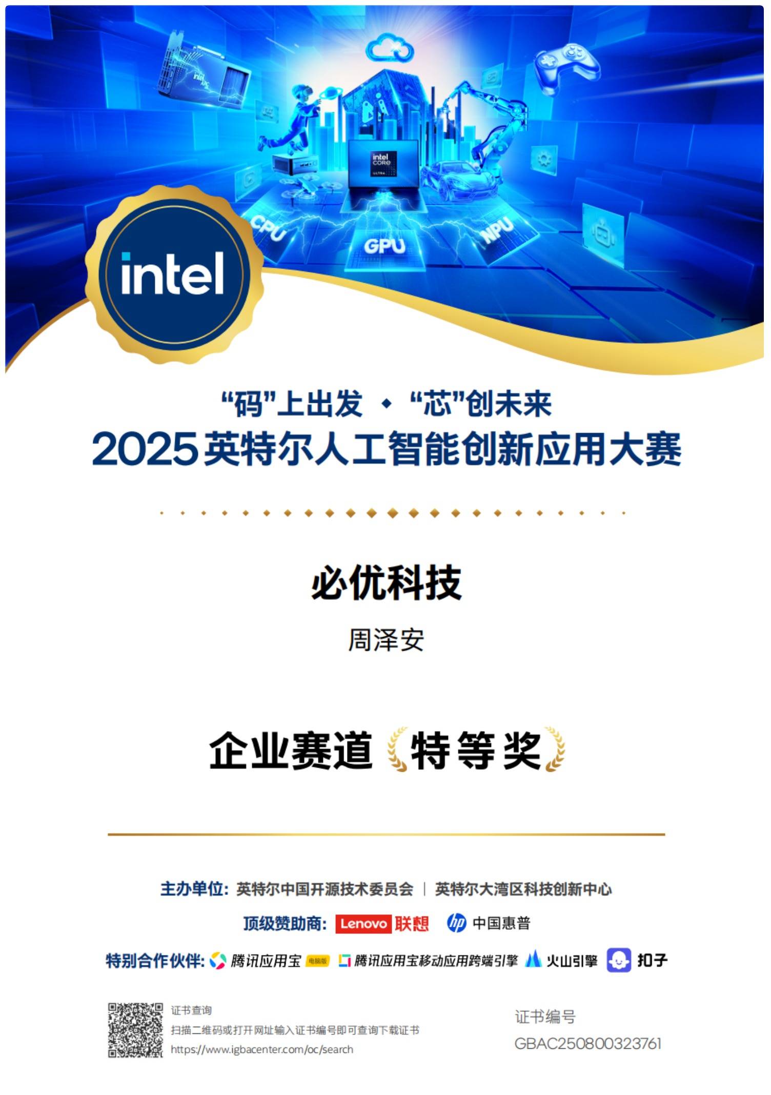 目前唯一一家在intel芯片适配并跑起来获得认可的AIPPT应用工具,且获得2025英特尔人工智能创新应用大赛特等奖荣誉。