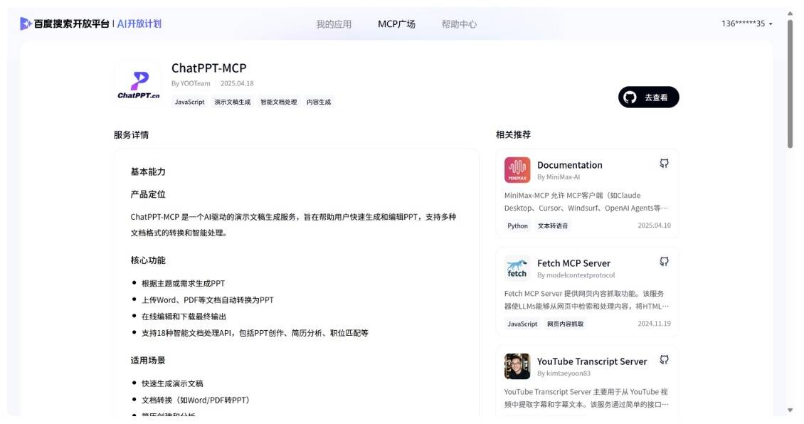 - 百度MCP:https://sai.baidu.com/ai/server/ChatPPT-MCP/YOOTeam?id=691d4c88d1dc856343dda0aeb41f596e