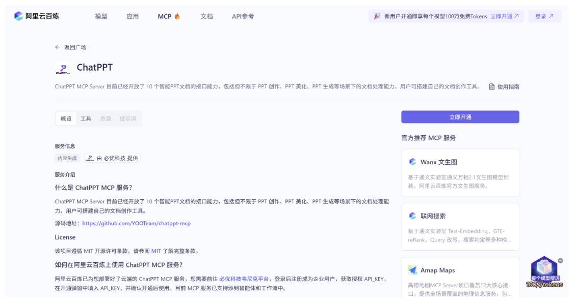 - 百炼地址:https://bailian.console.aliyun.com/?tab=mcp#/mcp-market/detail/ChatPPT