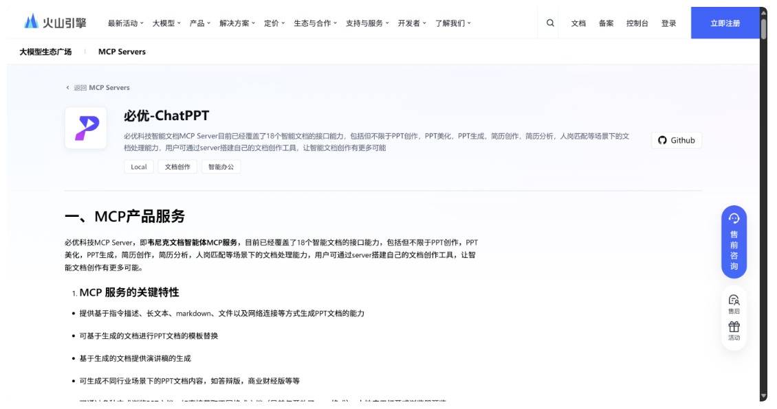 产品服务端:为ChatPPT 成熟的MCP Server服务功能,可以实现内容生成(渲染)PPT、重新美化排版、PPT修改、在线编辑与预览等功能(参考我司开源项目必优科技:https://github.com/YOOTeam/ChatPPT-MCP)