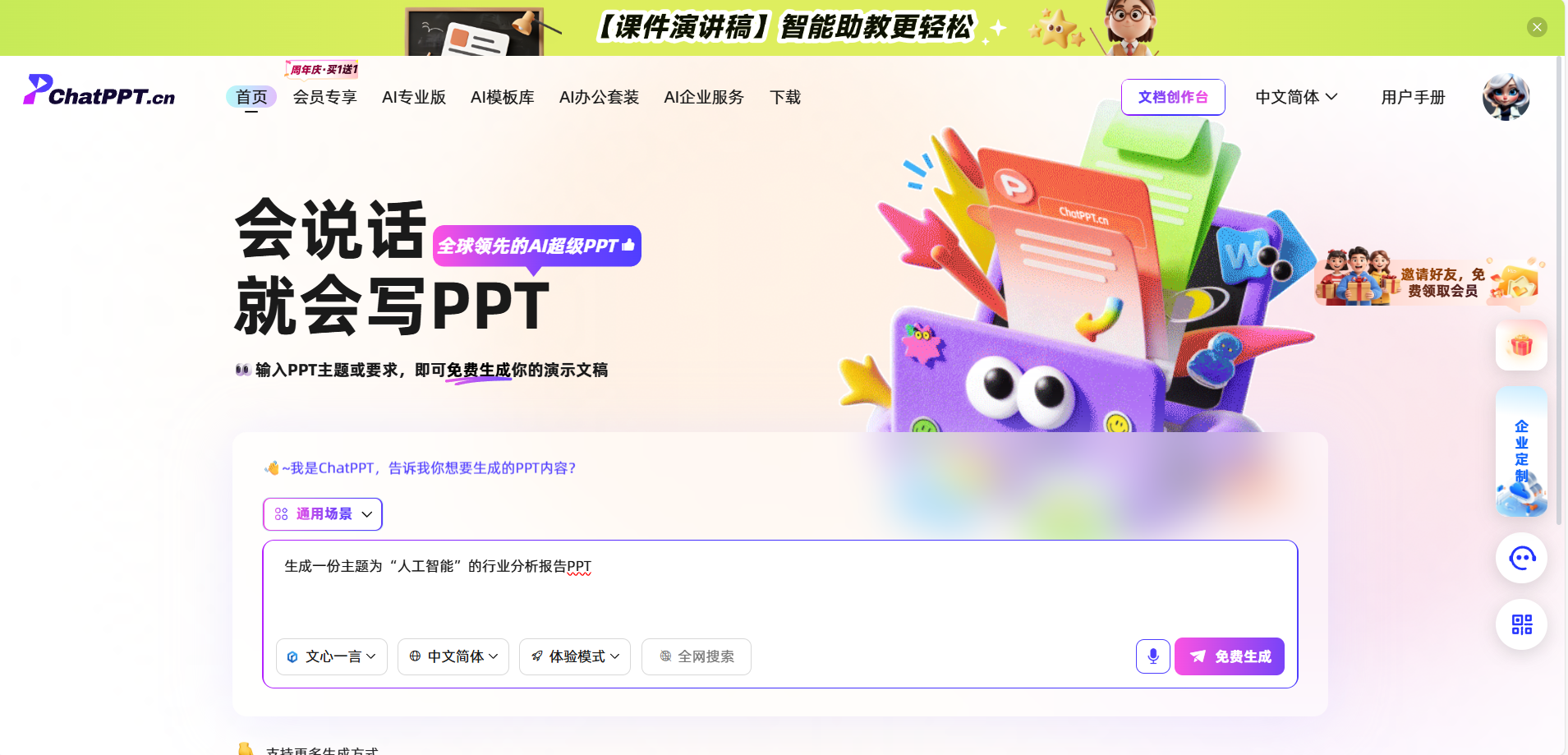 打开ChatPPT官网,直接进行对话描述即可生成你想要的PPT文档或者页面。例如“生成一份主题为‘人工智能’的行业分析报告PPT”