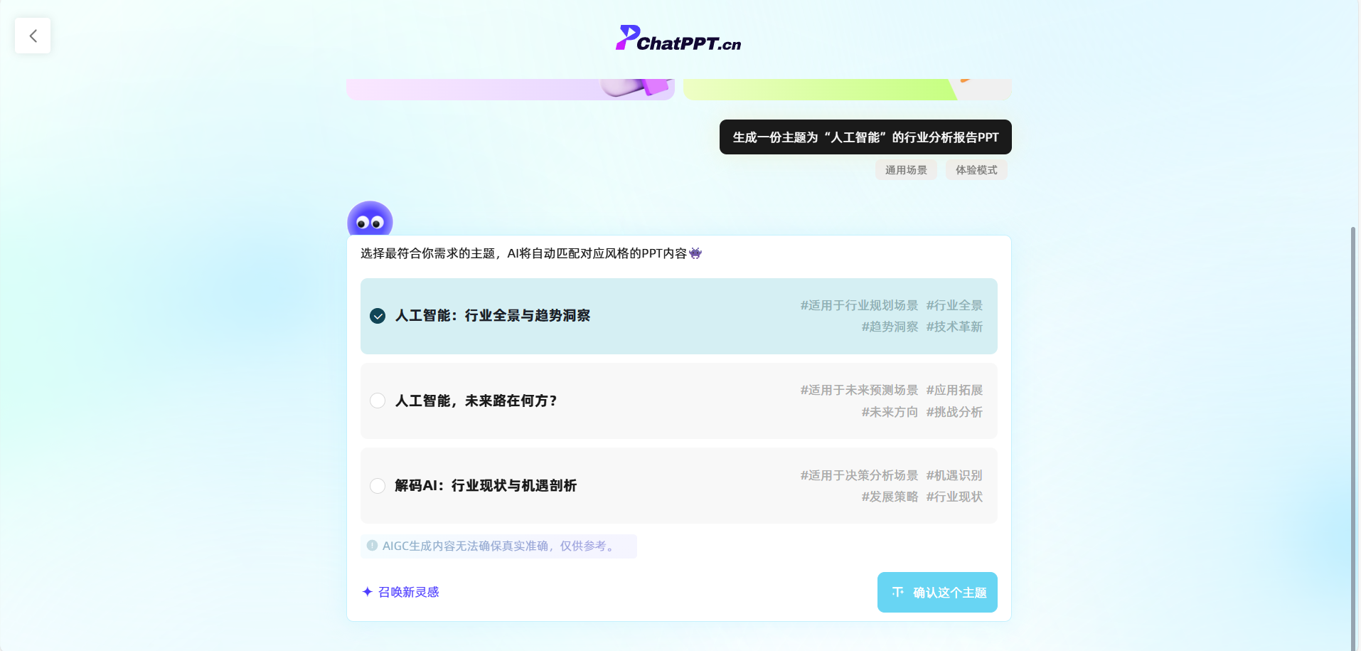 AI会根据你的需求生成3个标题,选择你认为最符合的一个主题,AI将自动匹配相对应的PPT风格