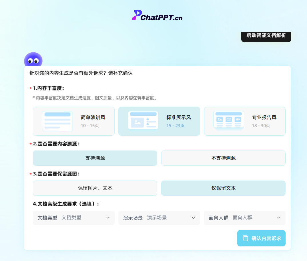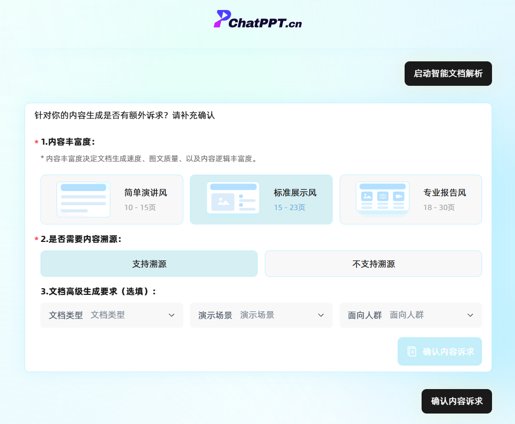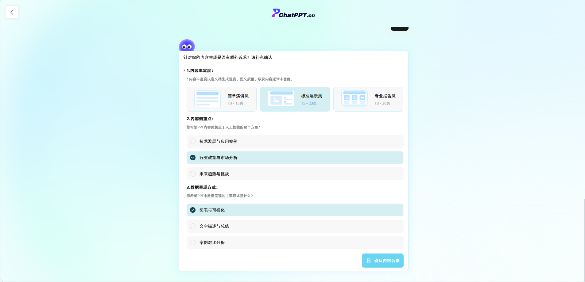 - 确认好额外内容诉求,即可按照流程生成(AI自动生成大纲→选择主题模板→生成完整PPT)