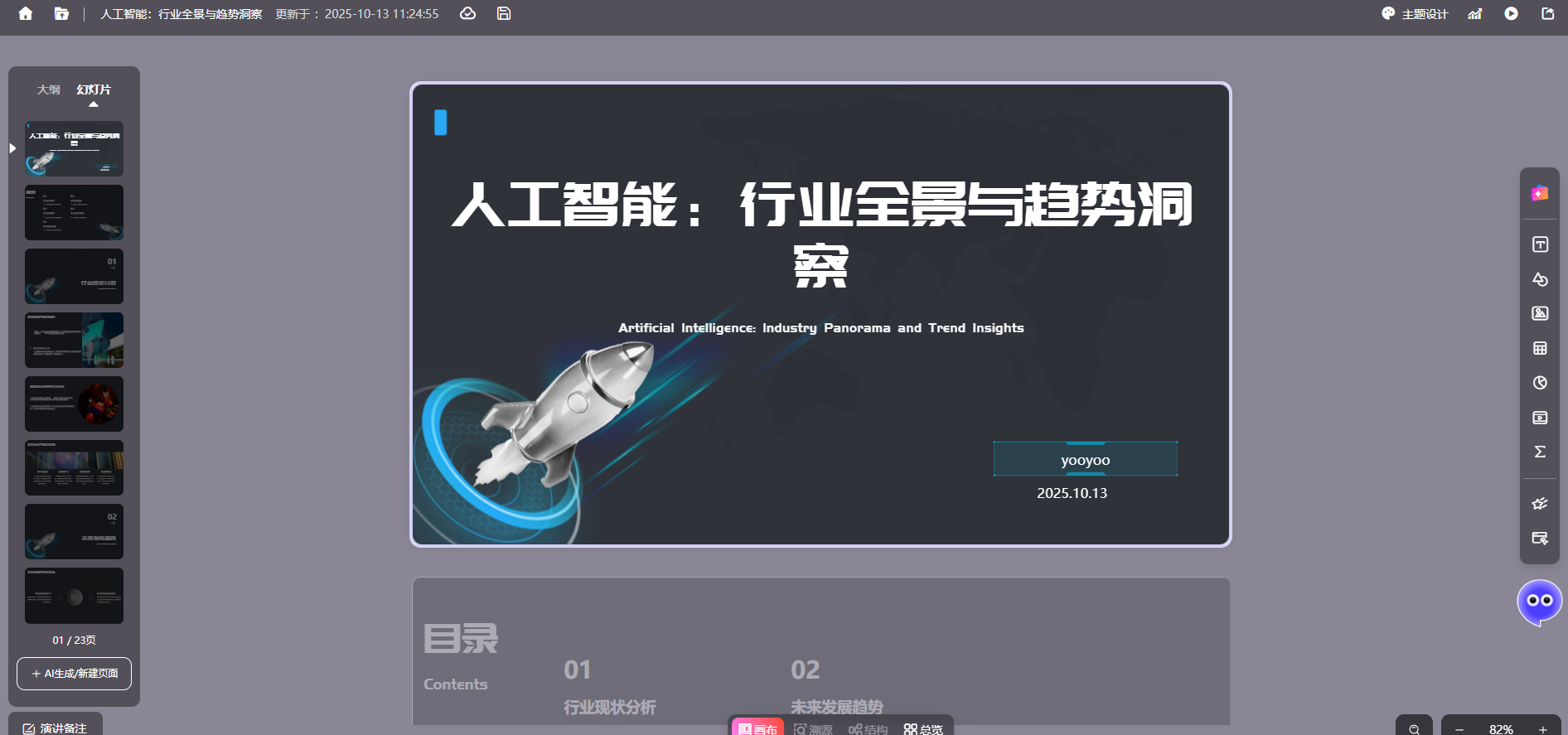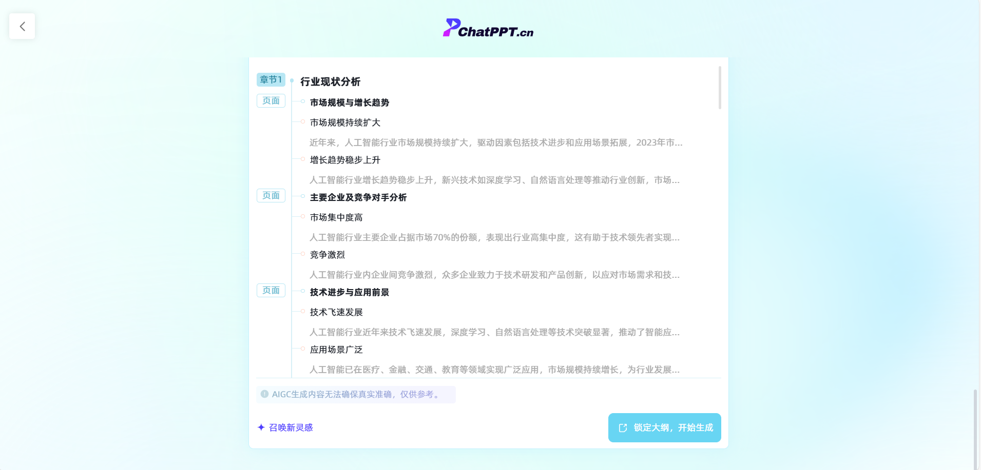 选择好风格主题后,AI将自动为你生成大纲,确认锁定大纲,一份完整的PPT在你眼前即刻生成