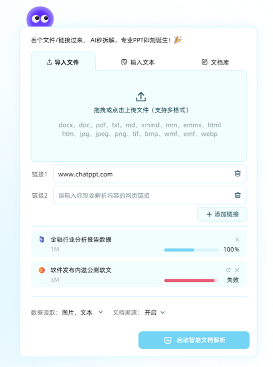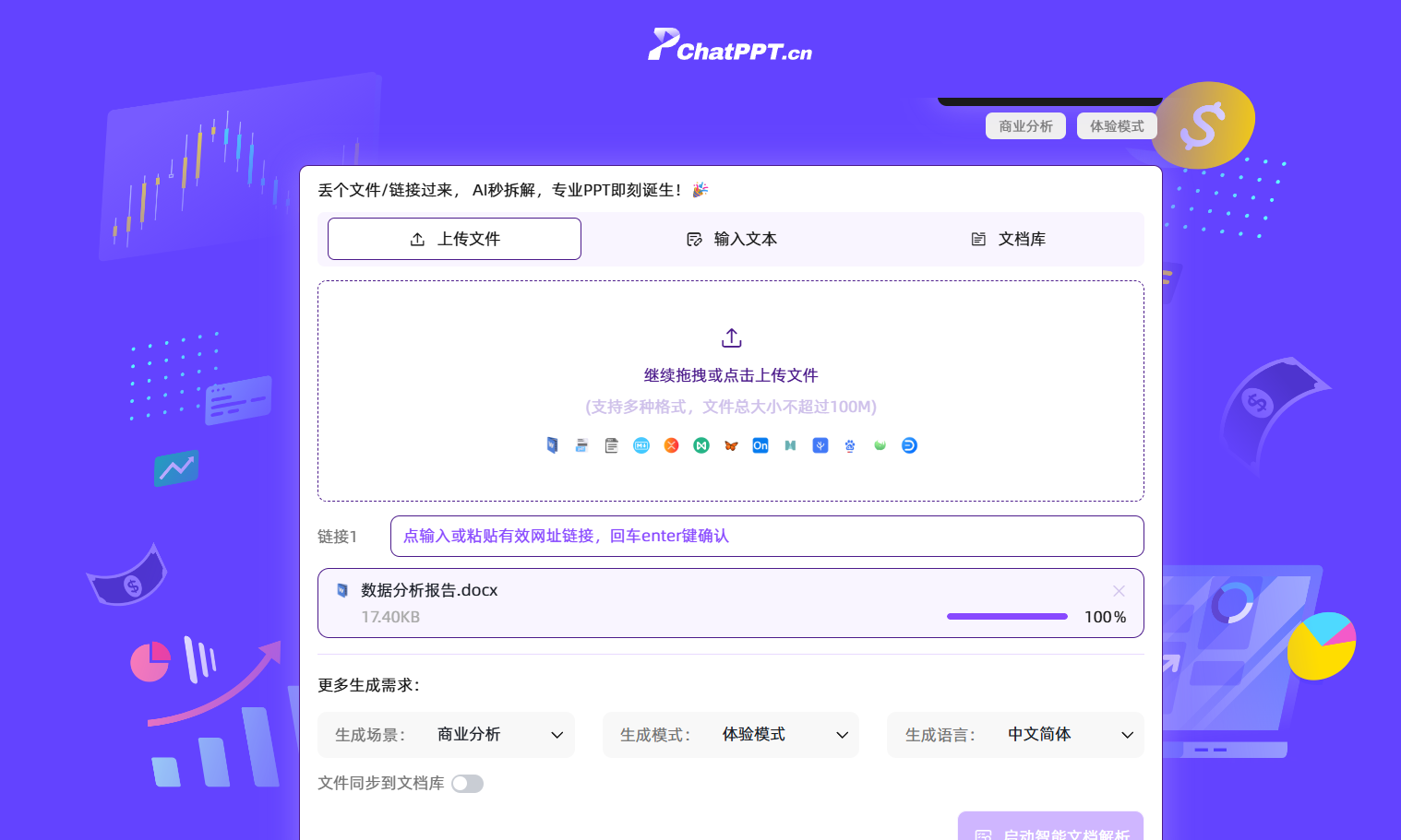 只用导入文件或链接,AI就能一键自动分析海量财经数据,为您生成专业、精美的报告PPT