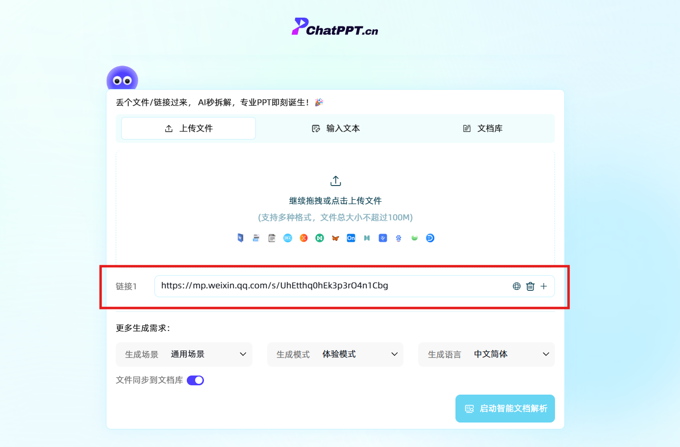 输入在线链接、内容网站或者全网搜索,进行搜索,并读取内容生成PPT。例如“根据链接https://mp.weixin.qq.com/s/UhEtthq0hEk3p3rO4n1Cbg 生成PPT”