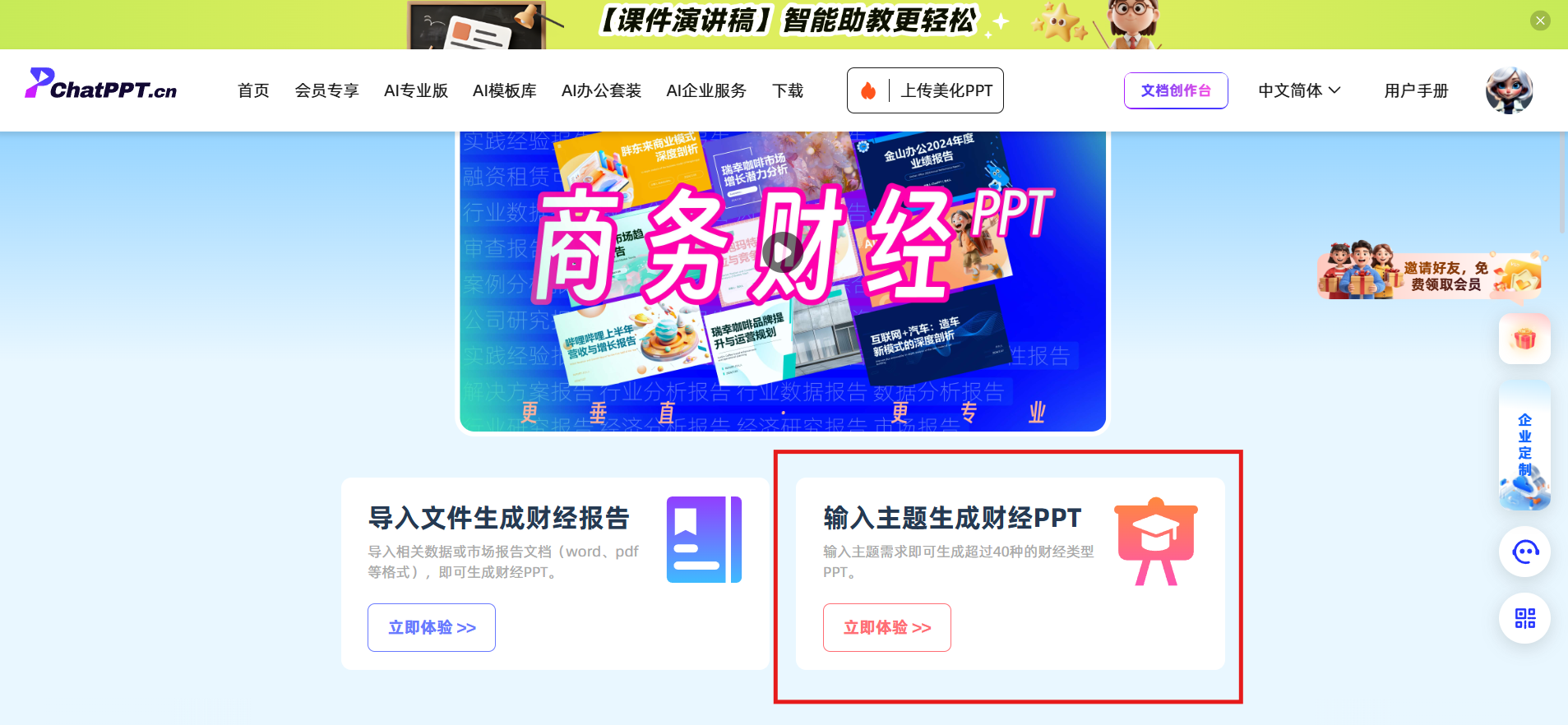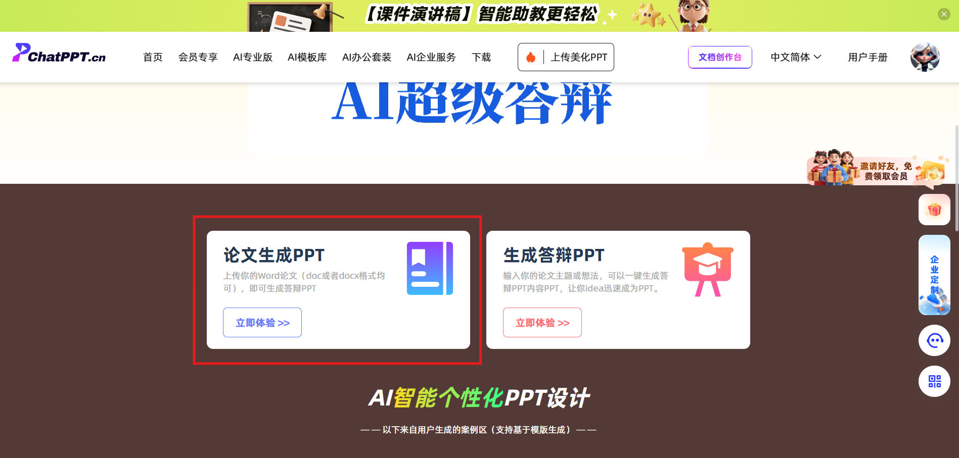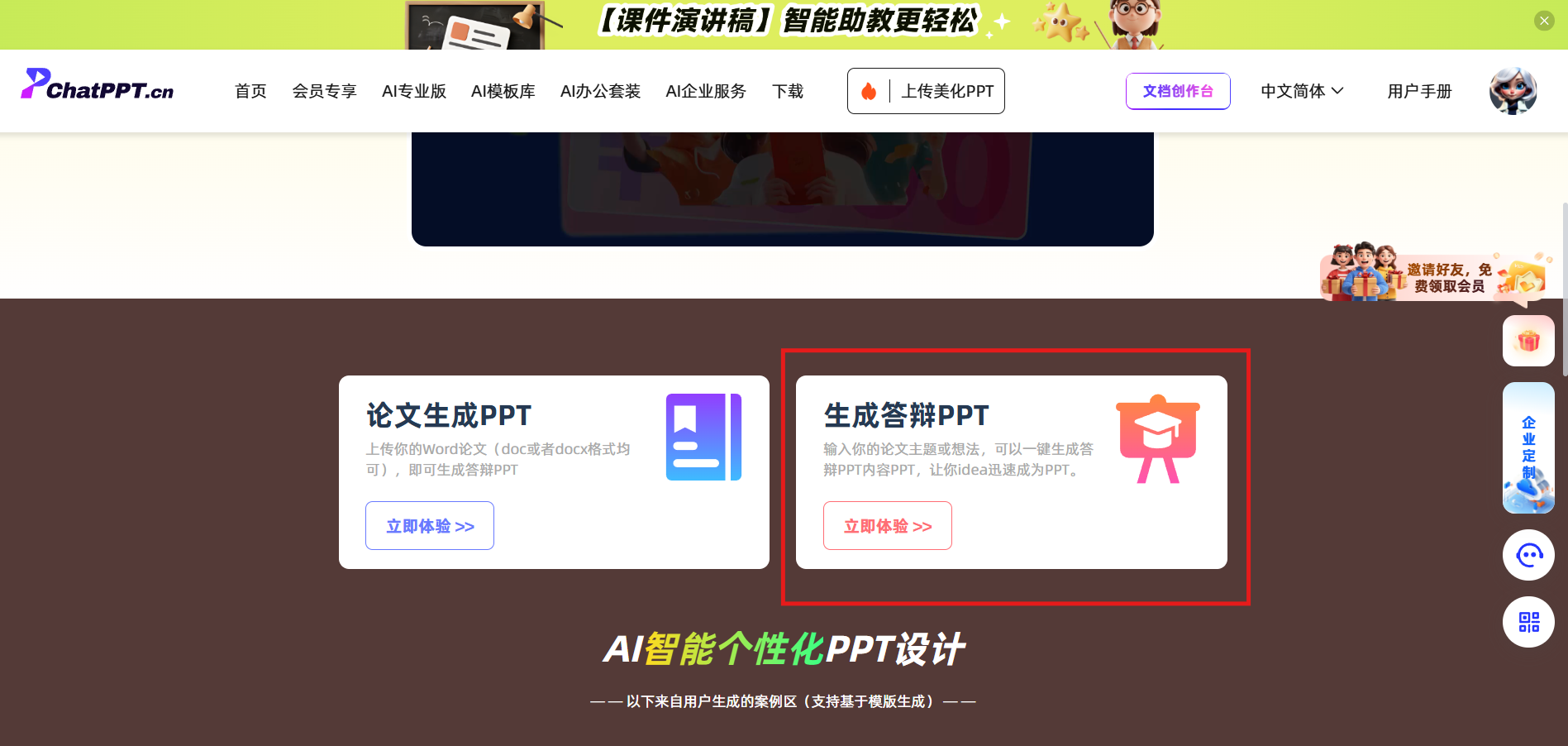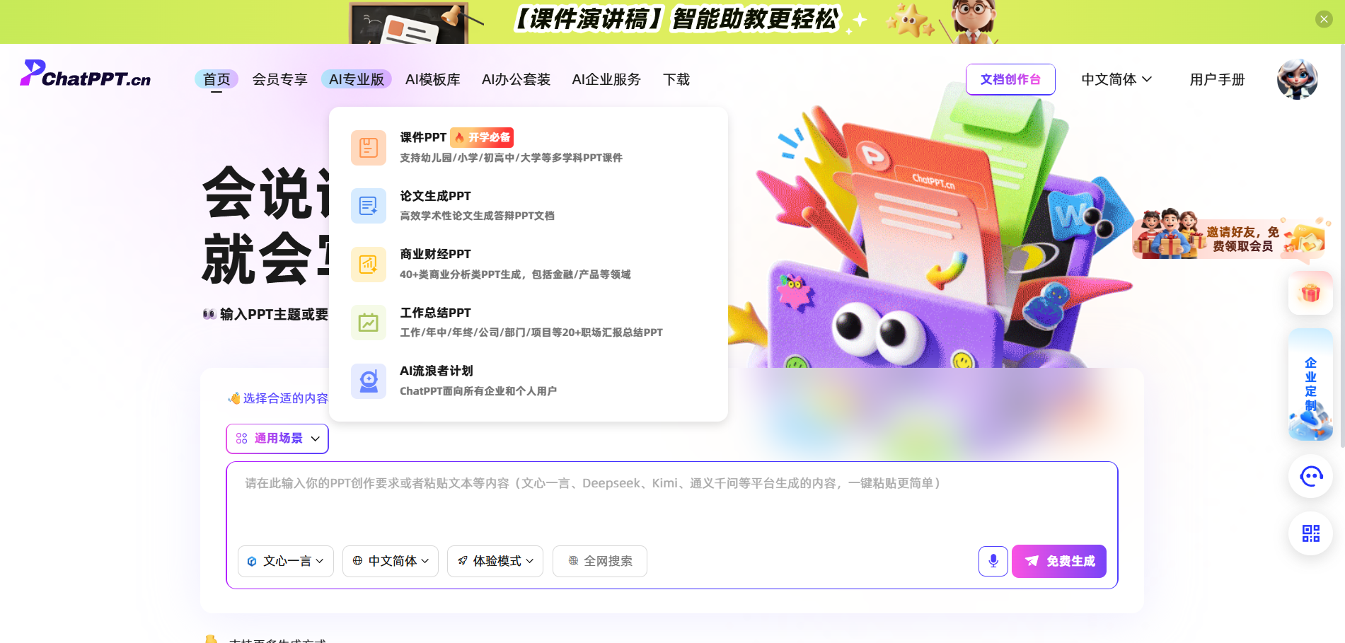 ChatPPT还提供专业场景的生成,如:论文答辩PPT、工作总结、商业分析、教育科技等。