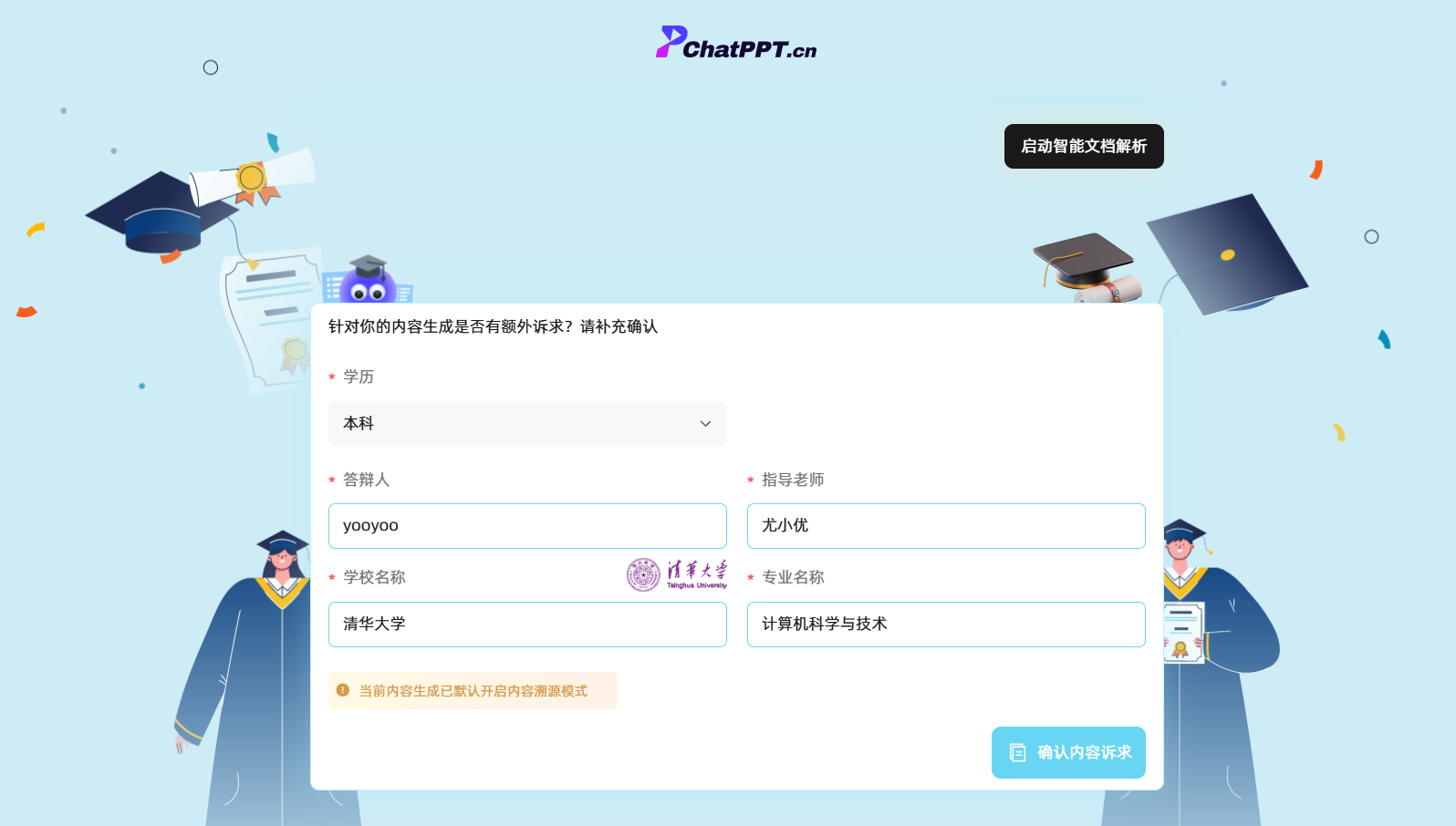 选择生成答辩PPT,无需上传论文文档,只需输入论文题目、学历、答辩人、专业等信息。AI就会自动为你适配风格主题,解析论文题目生成内容大纲。确认大纲和内容无误后即可生成完整的答辩PPT.