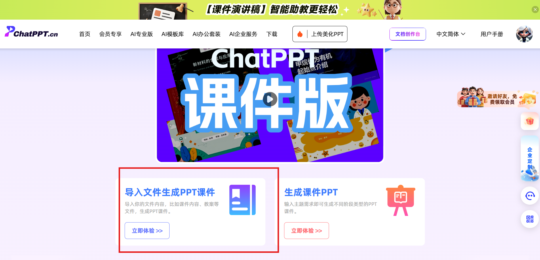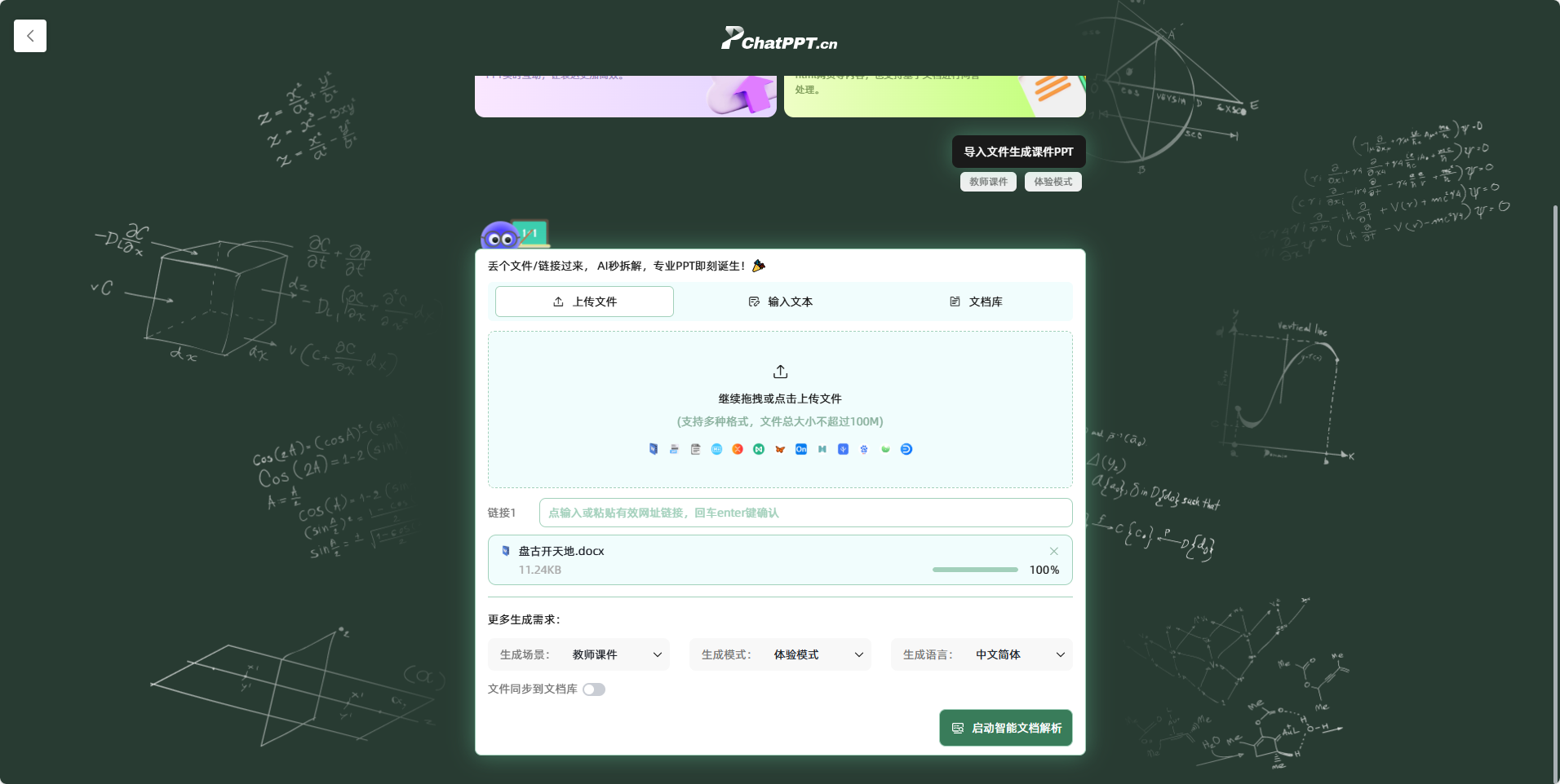 导入文件生成PPT课件。首先需要上传教案、原课文等文件