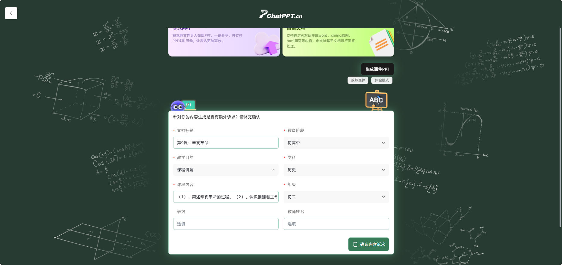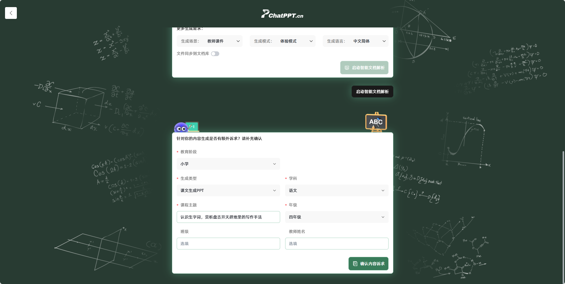 输入主题生成PPT除了要填入学段和学科等基本内容,还需要填入课程的内容、教学目的,内容描述更具体AI才能理解生成得更准确