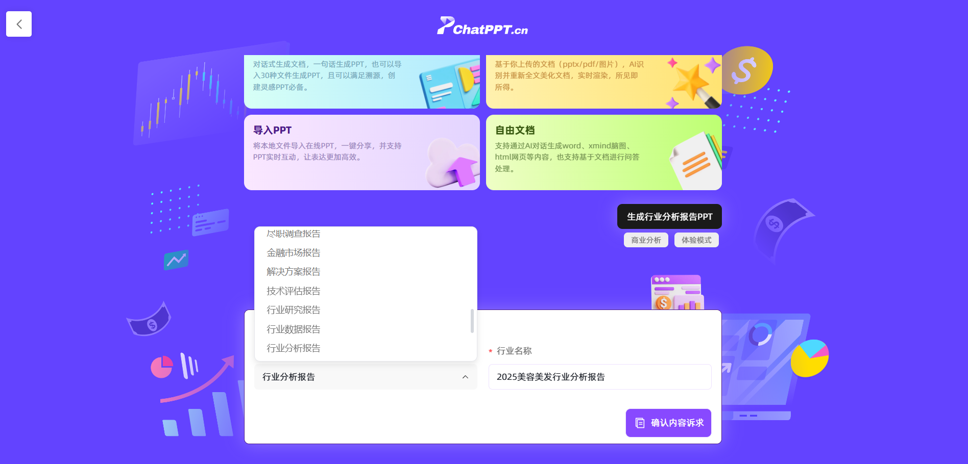 没有文件数据,只提供行业名称、报告类型,也能生成专业的报告PPT