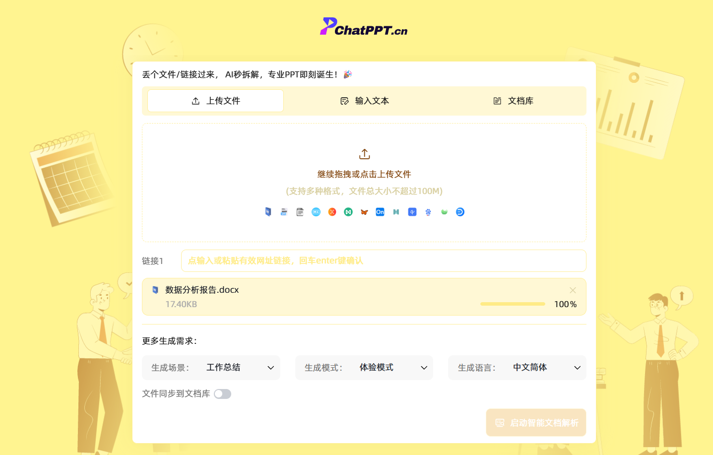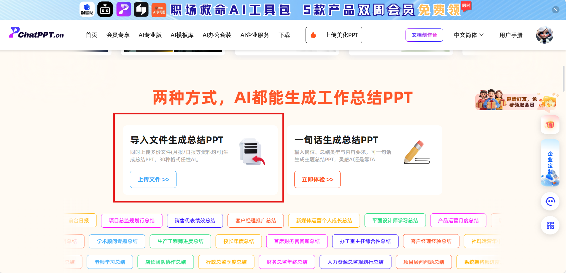 导入日报、月报、季度报等资料生成工作总结PPT,支持同时上传多份、多种格式的文件资料,AI全部为你搞定