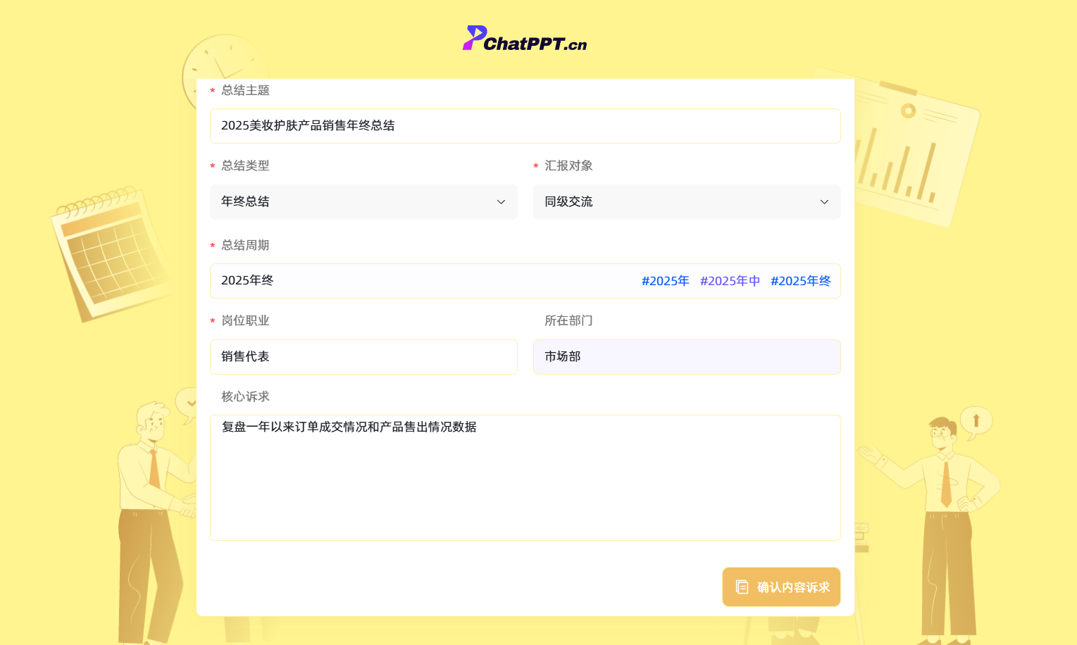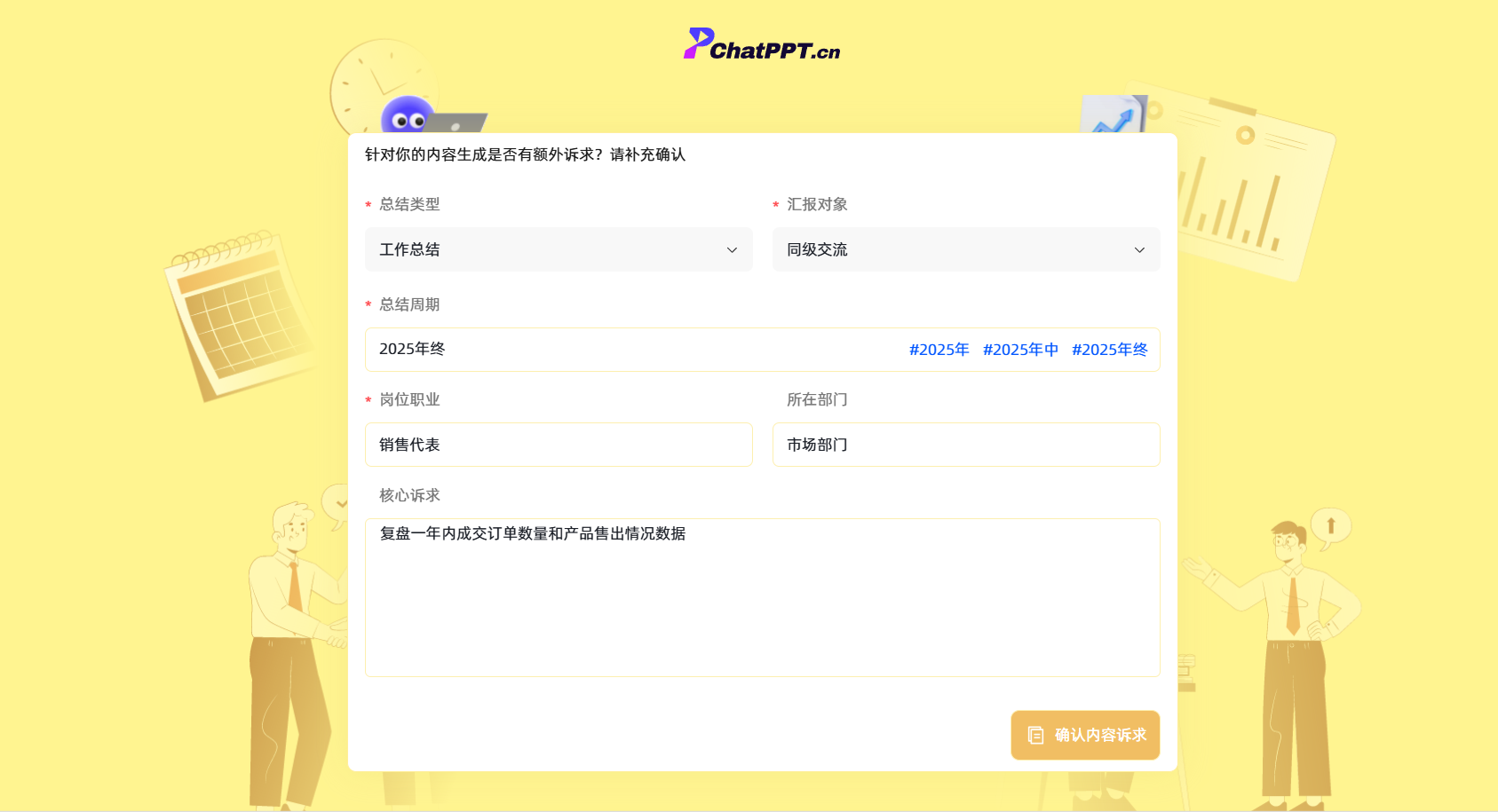 补充总结类型、汇报对象、总结周期和核心内容,AI才能更精确理解您的需求,生成更专业数据更准确的PPT