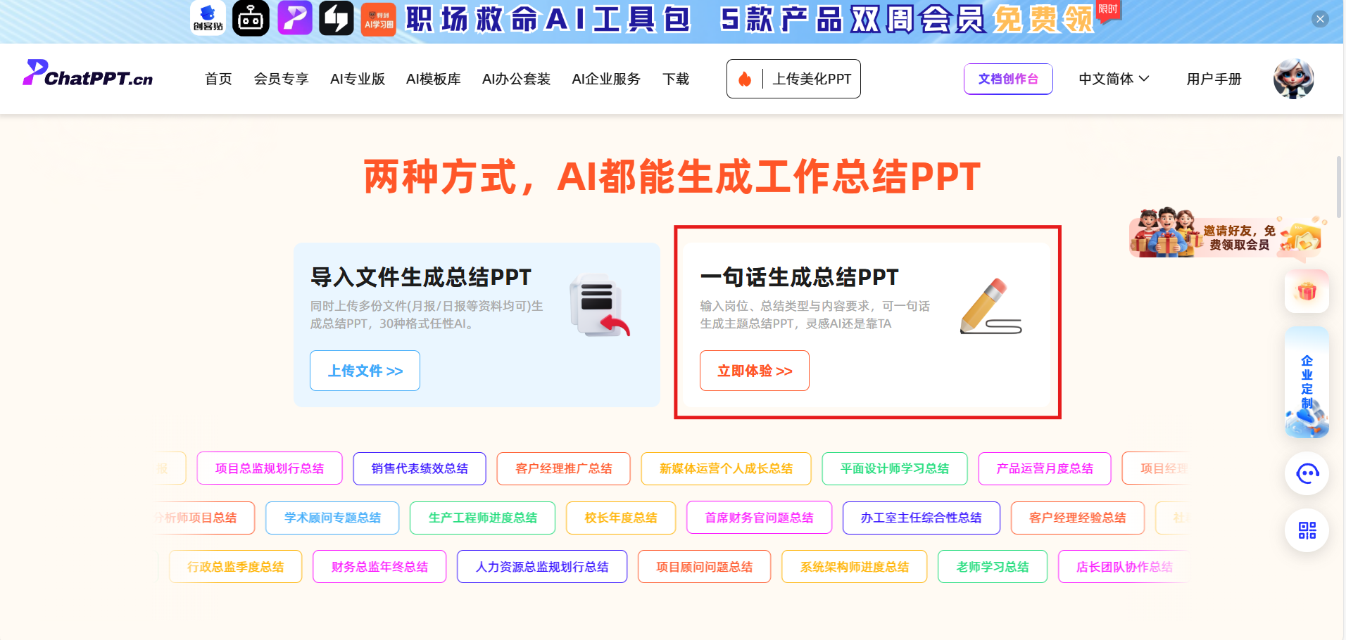 无需文件,输入岗位、总结类型与内容需求,一句话生成主题总结PPT,灵感AI还是靠它