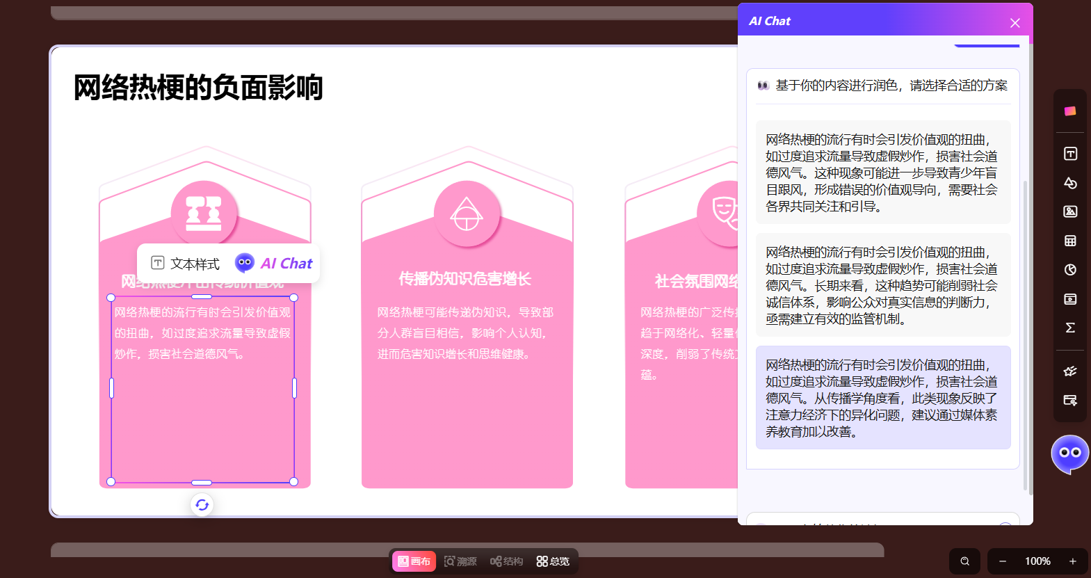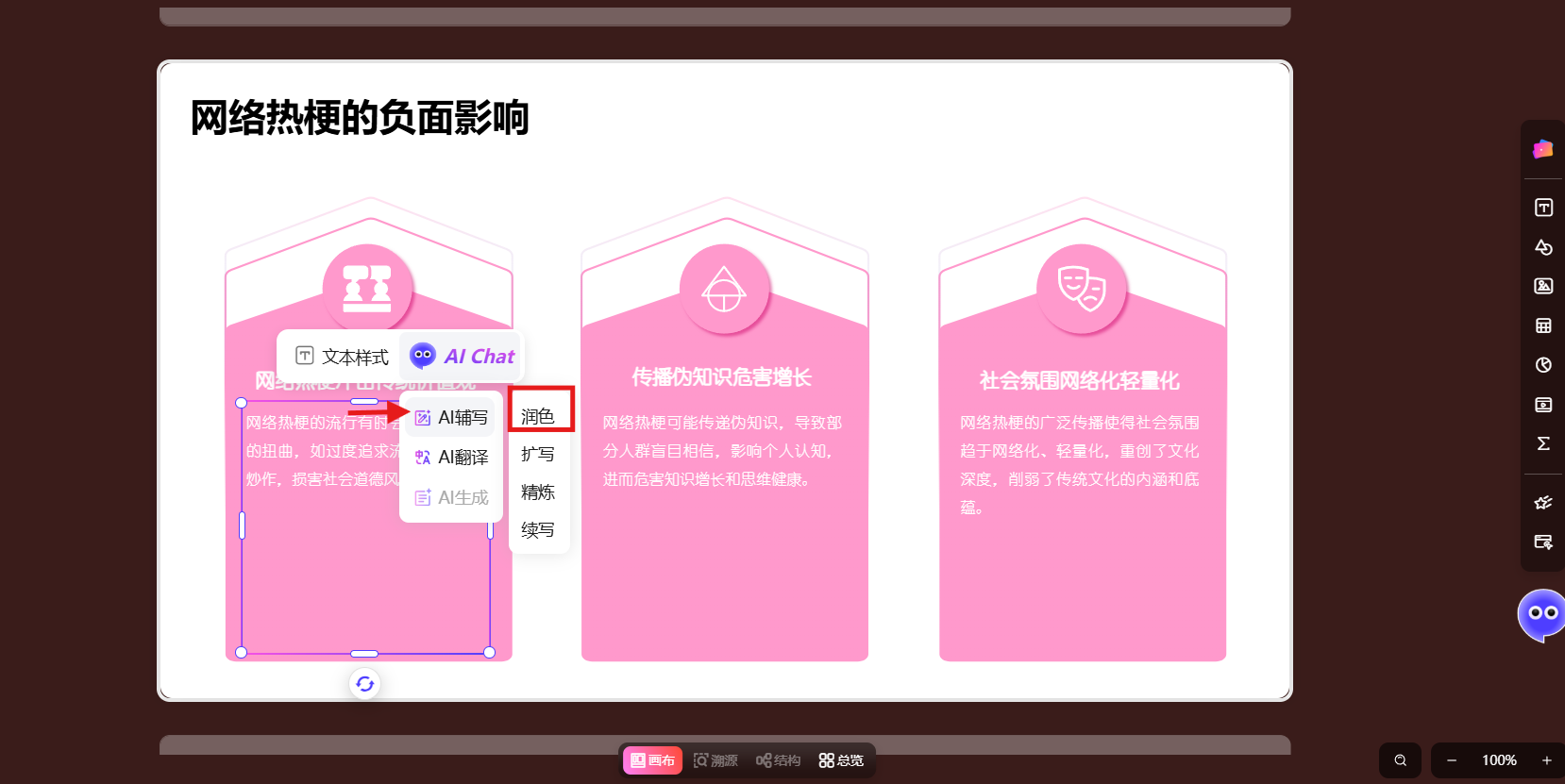 点击文本框,选择【AI Chat】→【AI辅写】→【润色】