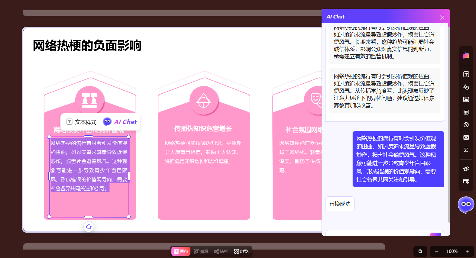 AI会根据原文本内容解析生成3个方案供用户选择,选择完成既替换成功